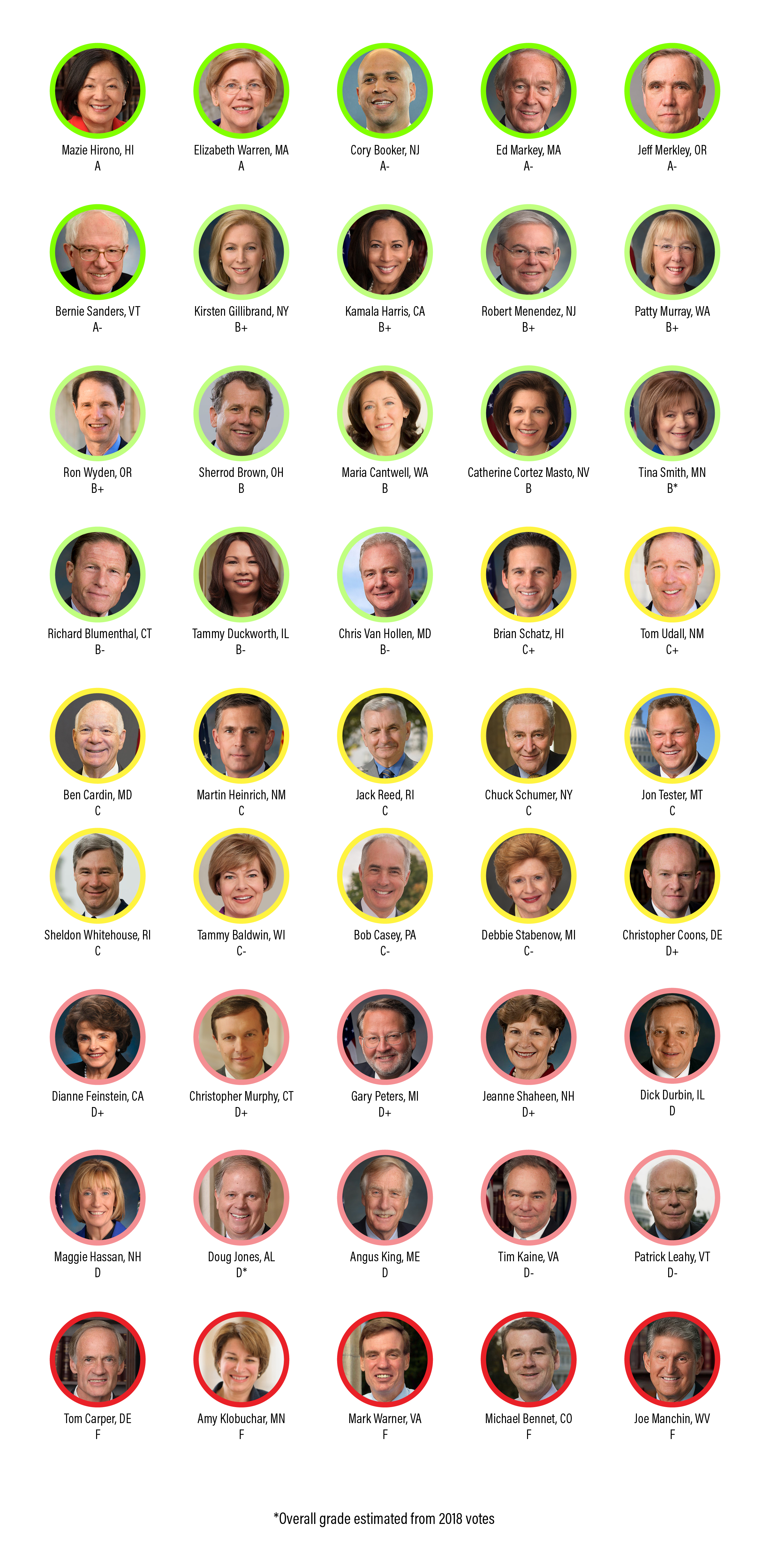 This report card documents Senate Democrats’ response to the far-right capture of our courts during Trump’s first two years in office. Senators receive a letter grade that reflects their willingness to fight Trump’s judges. Democrats who don’t fight hard enough were graded accordingly.